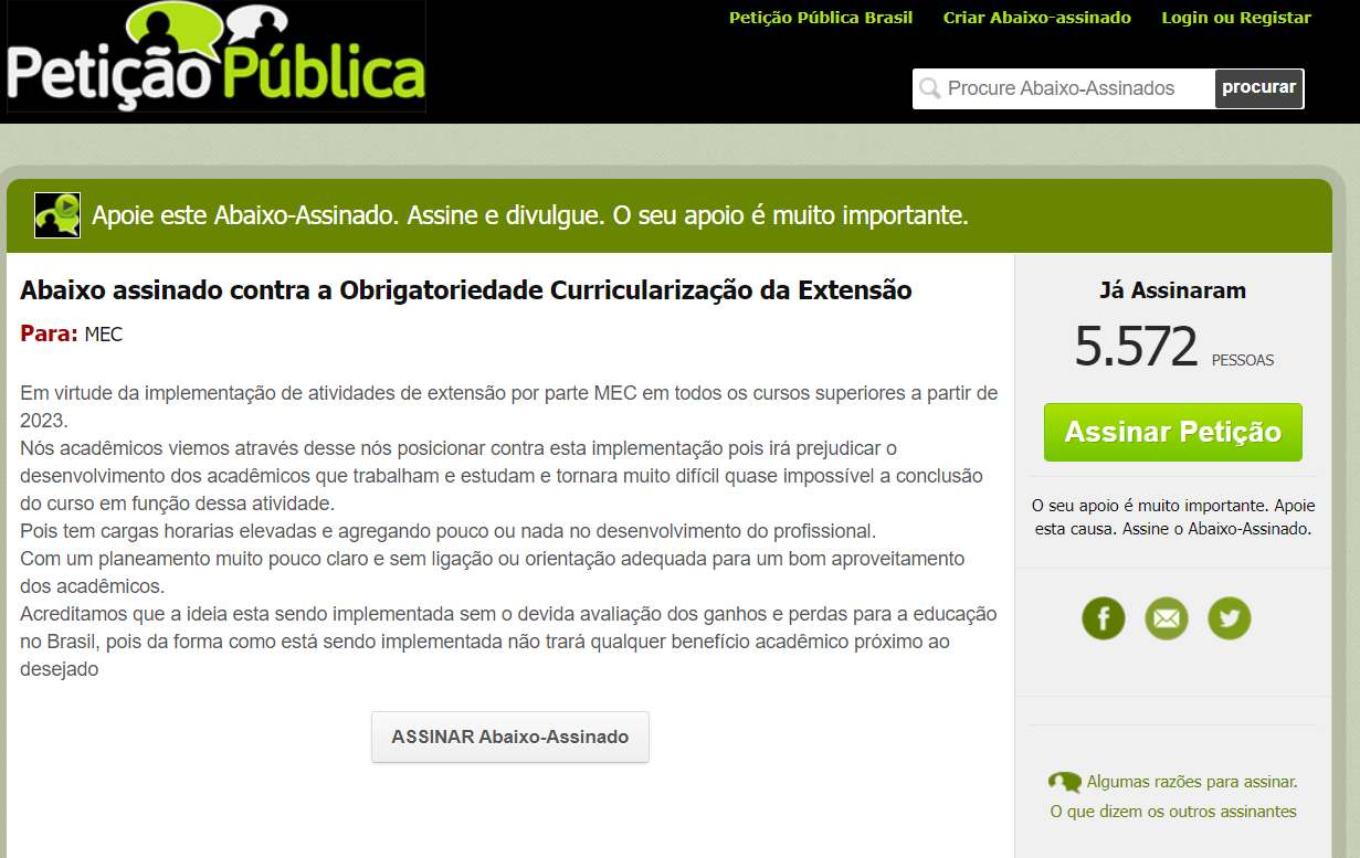 Samuel Luna, estudante do curso tecnólogo em Recursos Humanos na UniCesumar, conta que descobriu sobre a carga horária obrigatória de extensão, por meio de grupos de alunos no Facebook. “Eu estava muito focado na faculdade, então eu pensei: ‘vou tentar participar dos grupos de estudantes’ e aí eu vi umas pessoas falando de projetos de extensão”, comenta. Samuel ainda conta que ficou surpreso e ao mesmo tempo aliviado por ter descoberto da exigência de horas extracurriculares pela comunidade, e reforça que se não fossem os grupos de estudantes, talvez ele não soubesse desse critério, o que o impediria de terminar o curso. “Quando eu entendi o que era esse projeto de extensão e fui na plataforma, eu me assustei, porque (antes) não estavam lá as atividades. No momento em que uma lei vale, eu acho que além de me avisar, isso devia estar disponível na plataforma. A instituição está sempre me avisando na questão de notas ou trabalhos, eu acho que poderia ter sido mandado um e-mail para avisar sobre esse projeto, já que é algo que não vai permitir que eu conclua a faculdade caso não fizer”, reforça o estudante. A lei citada por Samuel é a Resolução CNE/CES nº 7/2018, que indica a obrigatoriedade do cumprimento das horas complementares em atividades de extensão para conclusão dos cursos superiores. As IES de todo o Brasil deveriam se adequar até dezembro de 2022.